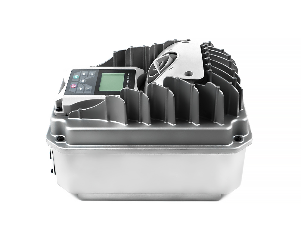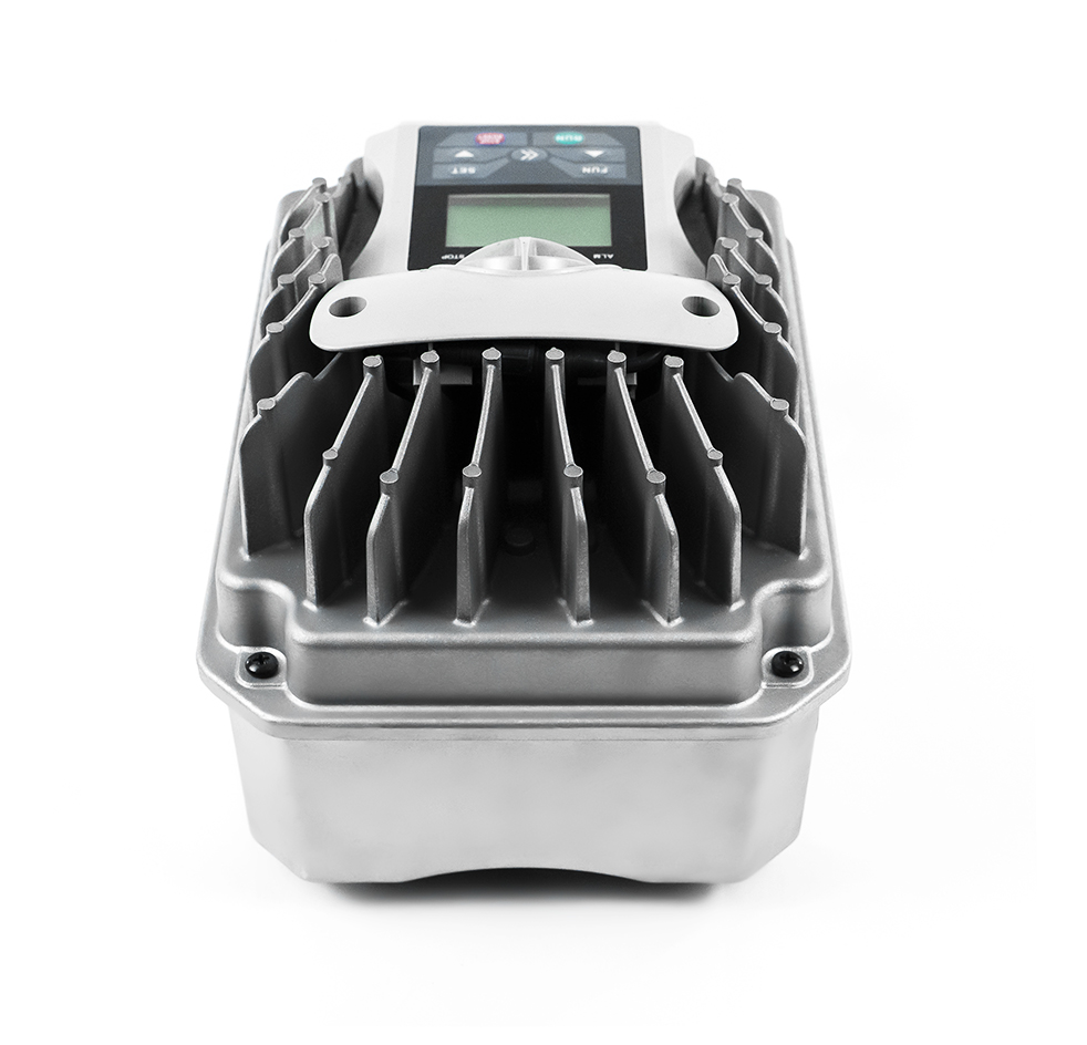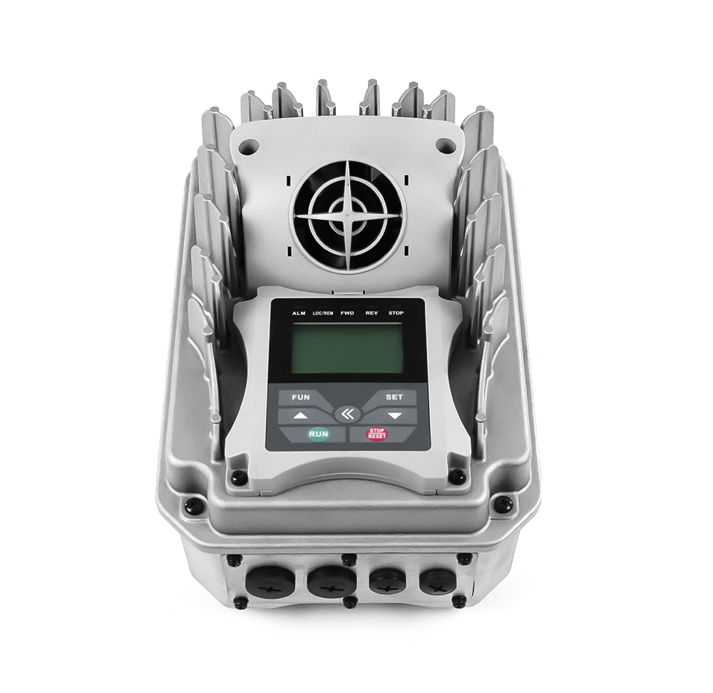 thermisch vom Motor entkoppelt IP55/NEMA4, vibrationsfest (4G). Flexibel konfigurierbares 4 Zeilen LCD Display.